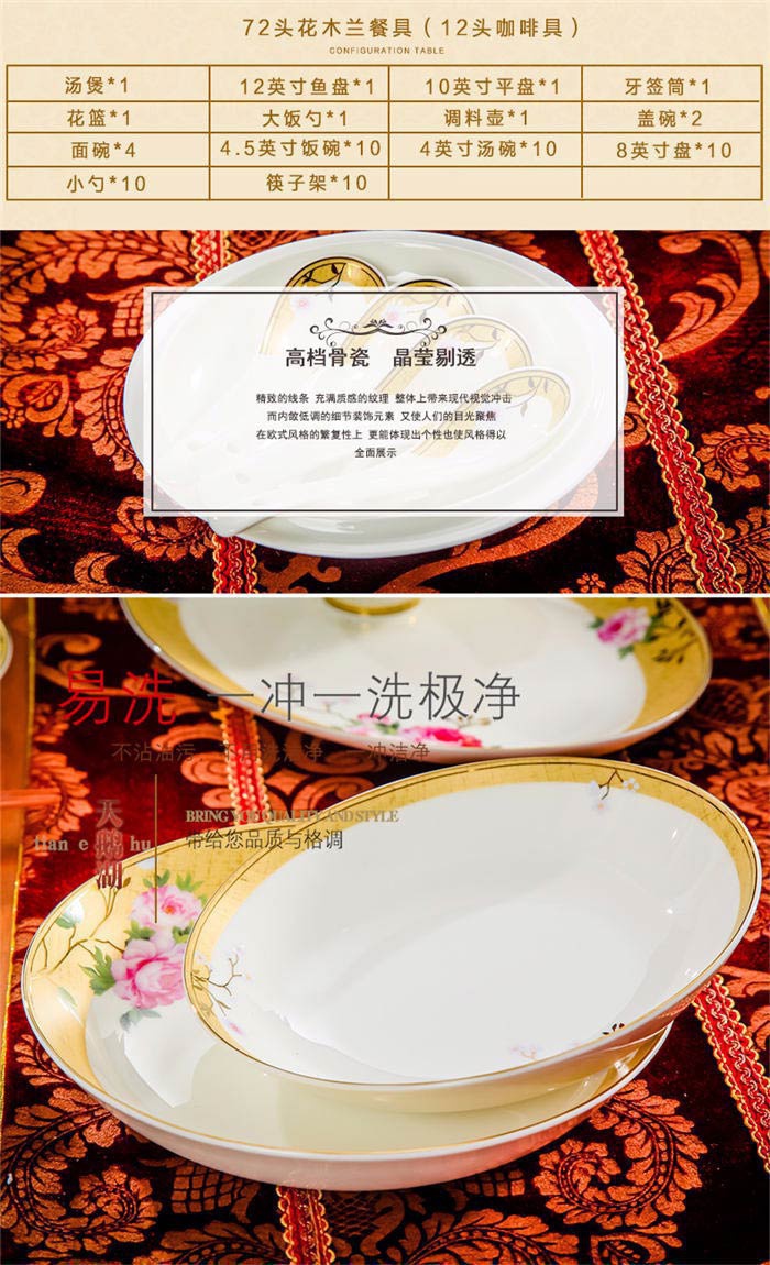 72頭花木蘭餐具,餐具60頭 ,一個(gè)湯煲,一個(gè)魚盤,一個(gè)十寸圓盤,一個(gè)牙簽筒,一個(gè)花籃,一個(gè)大飯勺,兩個(gè)調(diào)料壺,兩個(gè)蓋碗,四個(gè)碗,十個(gè)4.5寸飯碗,十個(gè)4寸湯碗,十個(gè)8寸盤,十個(gè)調(diào)羹,十個(gè)筷子架,