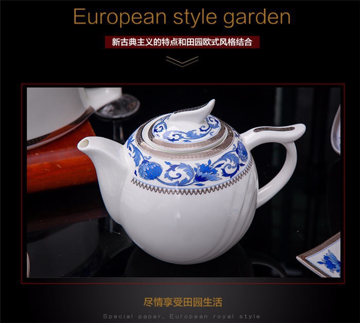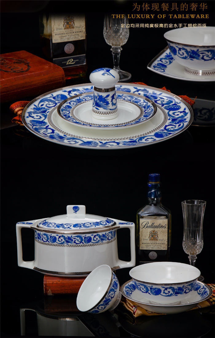 60頭德蘭城堡,一個(gè)湯煲,一個(gè)魚(yú)盤(pán),一個(gè)十四寸圓盤(pán),一個(gè)湯勺,一個(gè)牙簽筒,一個(gè)筷子筒,四個(gè)面碗,兩個(gè)沙拉碟,十個(gè)4.5寸飯碗,十個(gè)味碟,十個(gè)調(diào)羹,四個(gè)八寸圓盤(pán),四個(gè)八寸方盤(pán),十個(gè)筷子架。