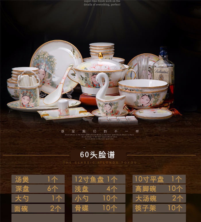 60頭臉譜,一個(gè)湯煲,一個(gè)飯勺,一個(gè)魚盤,一個(gè)十寸平盤,一個(gè)牙簽筒,一個(gè)煙灰缸,兩個(gè)面碗,兩個(gè)大湯碗,一個(gè)花籃,一個(gè)鳥,八塊八寸盤,十個(gè)4.5寸飯碗,十個(gè)骨碟,十個(gè)調(diào)羹,十個(gè)筷子架。