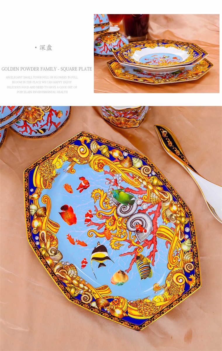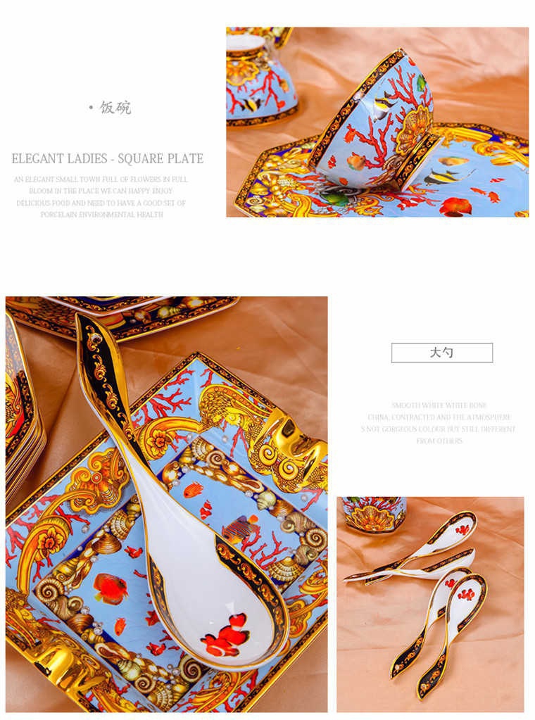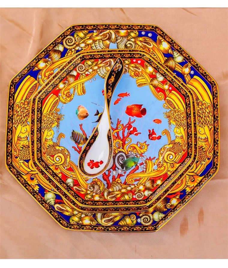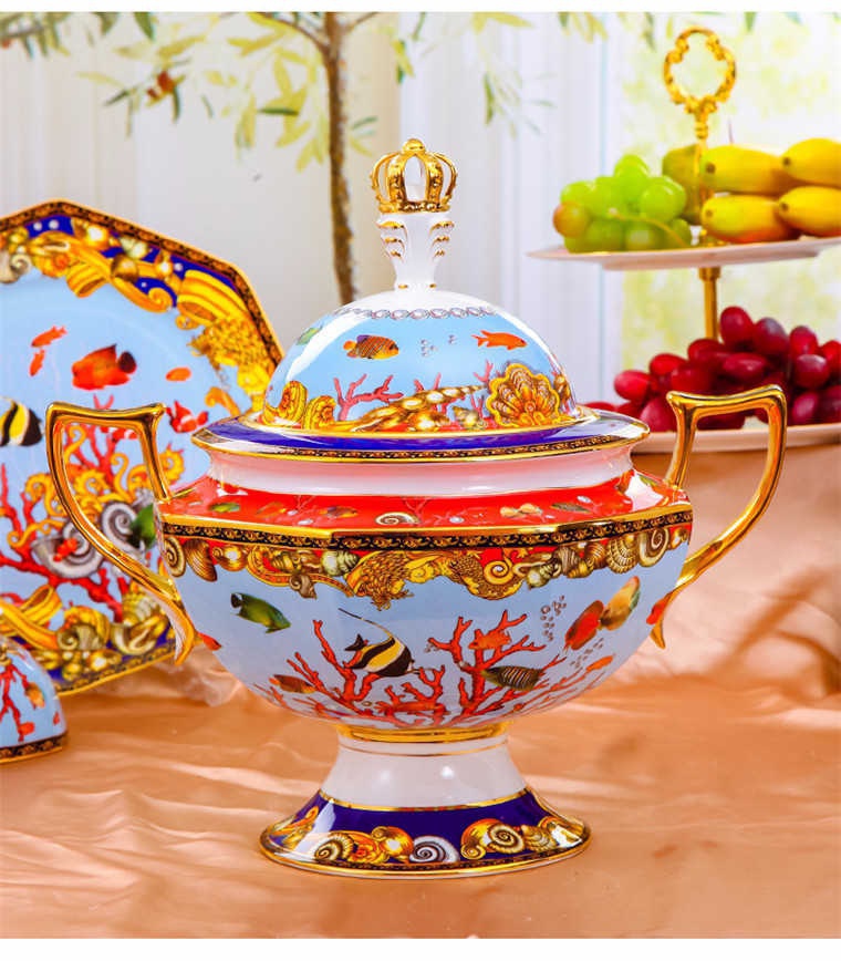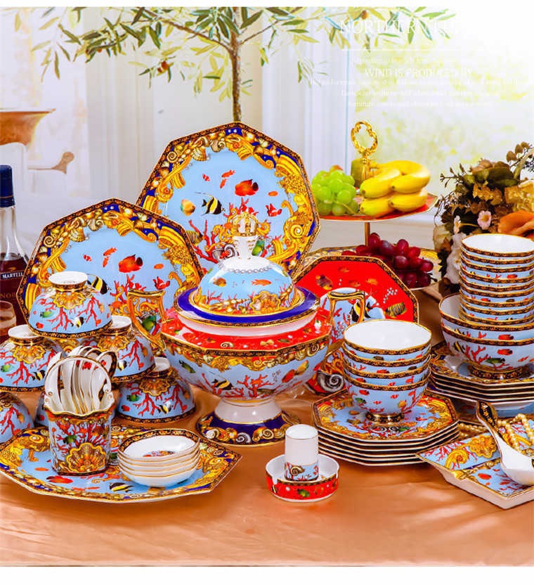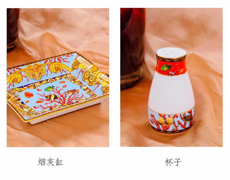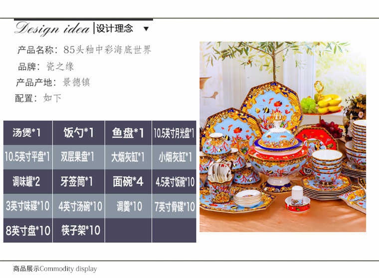85頭釉中彩海底世界,一個(gè)湯煲,一個(gè)飯勺,一個(gè)魚盤,一個(gè)10.5寸平盤,一個(gè)10.5寸月光盤,雙層果盤一個(gè),一個(gè)大煙缸,一個(gè)小煙缸,二個(gè)調(diào)料罐,一個(gè)牙簽筒,四個(gè)面碗,十個(gè)4.5寸飯碗,十個(gè)三寸調(diào)味碟,十個(gè)4寸湯碗,十個(gè)調(diào)羹,十個(gè)7寸骨碟,十個(gè)八寸盤,十個(gè)筷子架。